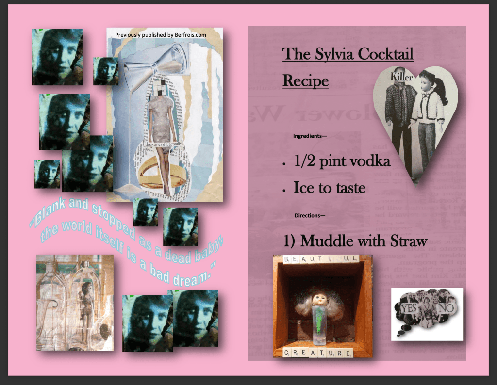 Besides the visual appeals, Bell Jar Barbie delivers textual allusions to Plath’s novel. On the fourth page of the pamphlet, Telling offers a “Sylvia Plath cocktail recipe”, which includes two ingredients: vodka and ice, referencing the scene from the novel when Esther Greenwood orders the drink: “I began to think vodka was my drink at last”. Drinking and humour merge with decisions (or indecisions) about dating and misogyny, while Plath gazes at you from the pages and you might want to ask: “What would Sylvia Plath do?”. While the zine is mainly inspired by Plath’s novel, there are many references to her poetry, from the bees sequence to “Surgeon at 2 a.m.” and “The Applicant”, and also Ted Hughes’s Birthday Letters. The pamphlet is a journey from self-irony to self-assertation via the works and image of Sylvia Plath.
