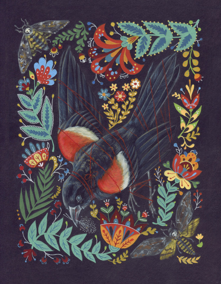 The Philadelphia-based artist Maryann Held focuses on zoology and botanist themes. The highly detailed animals and plant life follows the classic look of scientific papers but with a twist. The dark, surreal background with brightly colored central focus, the animals, in her artwork are naturalistic but with a mythical finish to them.